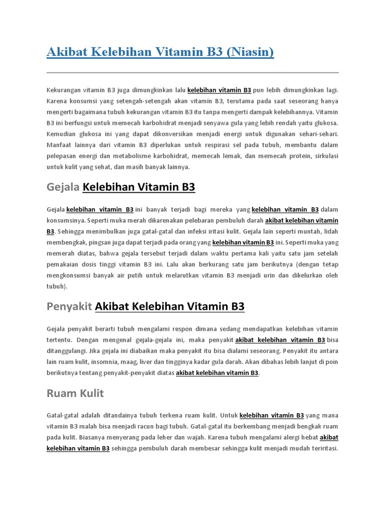 Asam lambung naik Akibat kelebihan vitamin C juga bisa menyebabkan orang yang memiliki penyakit lambung atau maag maka jangan mengkonsumsi vitamin C lebih dari 2000 mg perharinya karena akan memicu peningkatan asam lambung secara mendadak. Menyebabkan tubuh mengalami Kondisi ini ditandai dengan masalah pencernaan seperti mudah mual muntah dan perut terasa sakit. Pada umumnya hipervitaminosis B kompleks vitamin B1 B2 B3 B5 B6 B7 B9 dan B12 menyebabkan perubahan pada kulit mual luka pada usus liver berlemak meningkatkan kadar gula dan asam urat dalam darah.