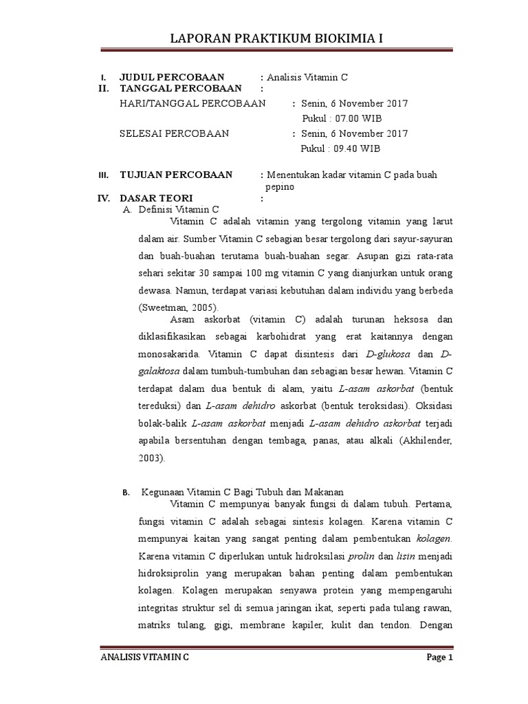 Laporan Biokimia Vitamin C - 33 Pembahasan Vitamin C merupakan salah satu vitamin yang diperlukan oleh tubuh dan berfungsi untuk meningkatkan sistem imunitas tubuh. Laporan praktikum biokimia pengujian kadar vitamin c disusun oleh.