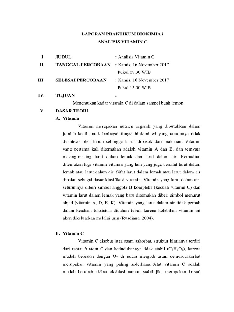 Vitamin merupakan suatu molekul organik yang dibutuhkan oleh tubuh dalam jumlah kecilberfungsi sebagai koenzim pada reaksi metabolismeVitamin umumnya tidak dapat dibuat oleh tubuh manusiakarena itu vitamin harus diperoleh dari bahan pangan yang dikonsumsiVitamin C adalah vitamin yang tergolong larut dalam air dan mudah mengalami oksidasiVitamin C dapat terbentuk. Annisa Nurul Chaerani 411109059 ANALIS KESEHATAN D3 SEKOLAH TINGGI ILMU KESEHATAN JENDERAL AHMAD YANI CIMAHI. Hasil yang didapatkan pada percobaan berbeda dengan literatur.