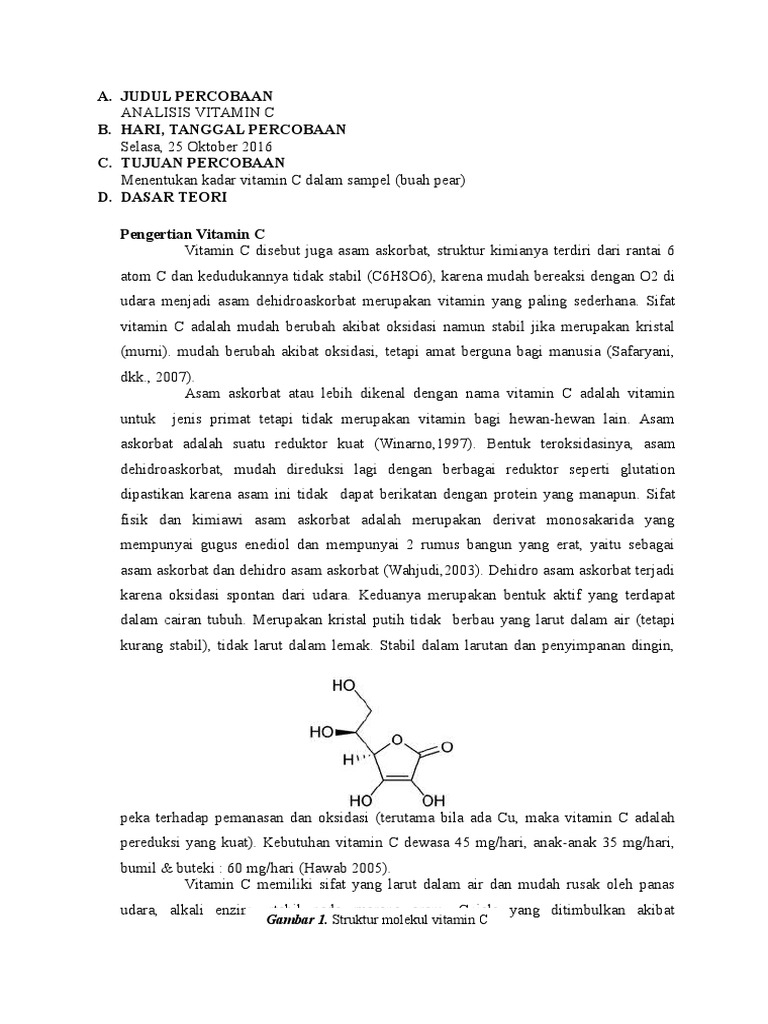 Menguji secara kualitatif vitamin C pada minuman. DASAR TEORI Vitamin adalah suatu zat senyawa kompleks yang sangat dibutuhkan oleh tubuh kita dengan fungsi untuk membantu pengaturan dari proses kegiatan dalam tubuh. Mudah berubah akibat oksidasi tetapi amat berguna bagi manusia Safaryani dkk 2007.