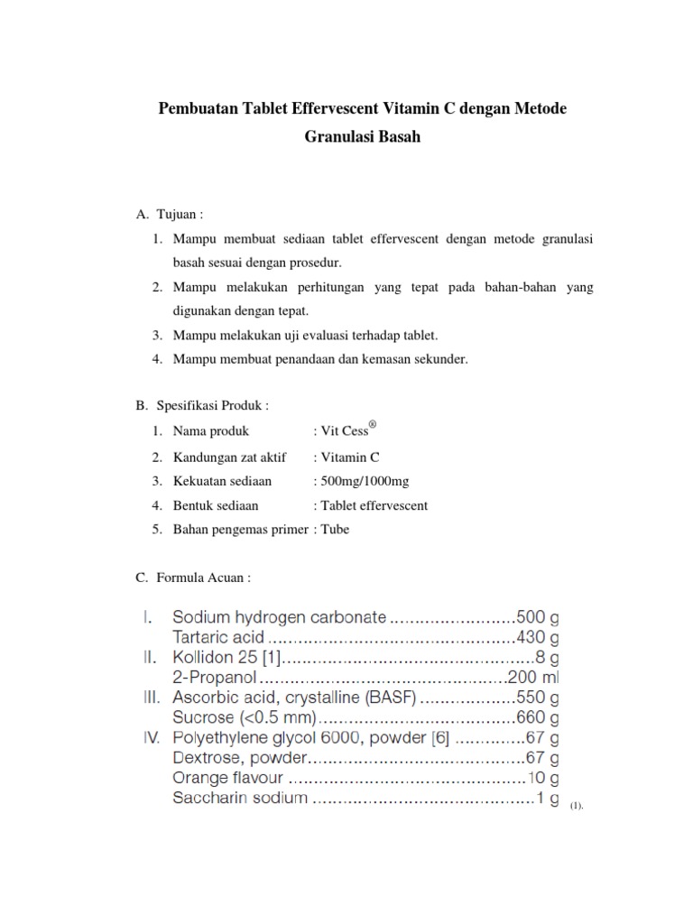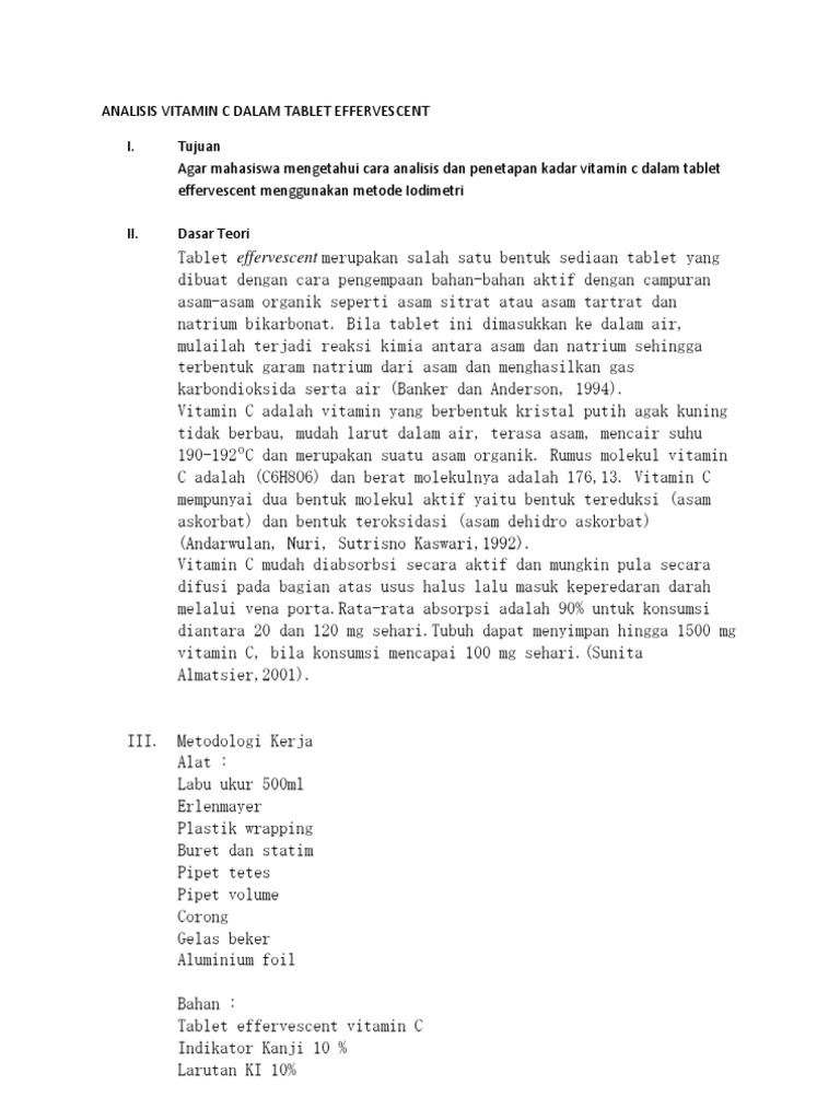 Formula tablet effervescent kombinasi ferrous sulfat dan vitamin C dapat dibuat tablet dengan baik dan memiliki sifat fisik paling baik dihasilkan pada F IV diteruskan dengan F III dan F V. BAB V PEMBAHASAN Pada praktikum pembuatan tablet vitamin C dengan metode cetak langsung digunakan formula standar. The Vitamin C Effervescent Tablet products offered by these companies above range from 01 to 5.