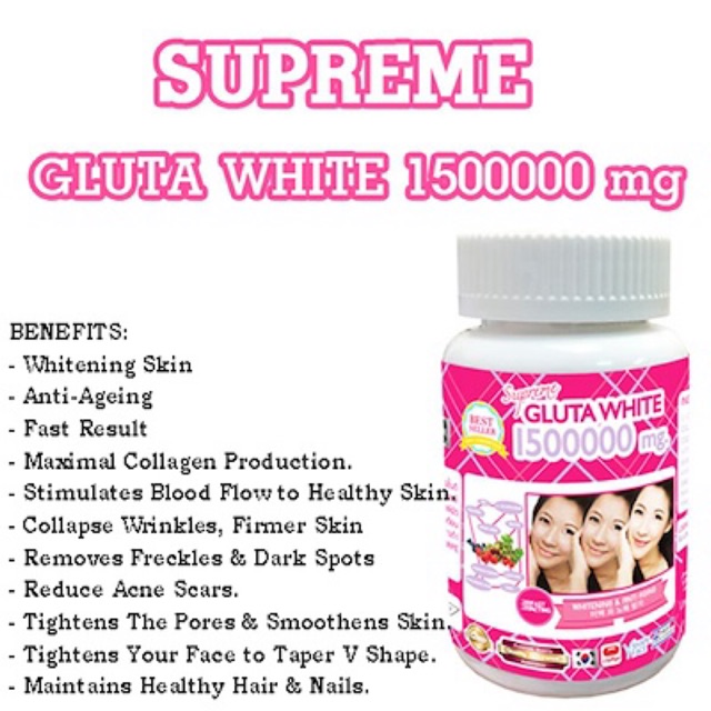 Supreme GLUTA WHITE 1500000 mg. Dare you that really works in one box. Taking Gluta-White is easy because its in easy to swallow capsule form.