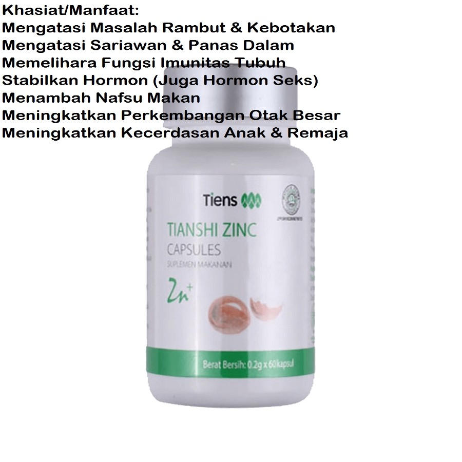 Khusus untuk zinc capsules juga mengandung khasiat tersendiri. Zinc Tiens Mengatasi kurang nafsu makan diare hormon seksual terganggudisfungsi seksual penyembuhan luka lambat sariawan dan panas dalam pertumbuhan terhambat cacat kandungan jerawat dll. Zinc adalah salah satu unsur utama kehidupan dan merupakan micro nutrient penting yang banyak tersebar di dalam tubuh manusia.