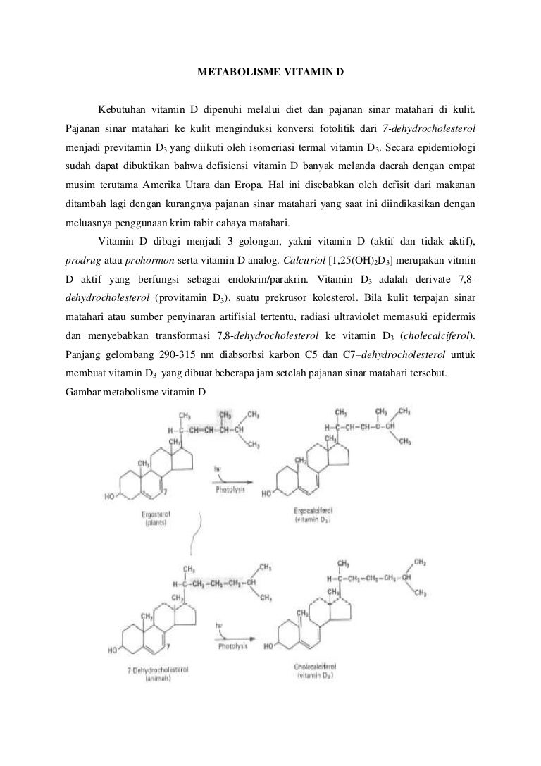 Vitamin D3 ini adalah bentuk awal dari vitamin D yang akan langsung dikirim ke organ hati dan ginjal untuk menghasilkan vitamin D yang dibutuhkan oleh tubuh. Maka dari itu semakin tertutup orang berpakaian semakin sedikit penyerapannya. METABOLISME VITAMIN D Individu yang mendapat sinar matahari sangat kuat dapat mempunyai kadar 25 OHD mencapai 250 nmoll 100 ngml.