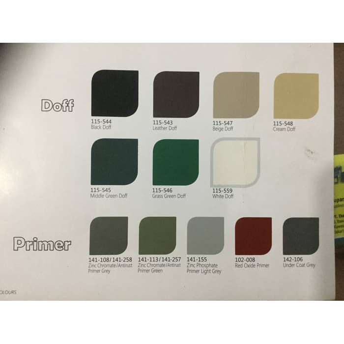 Sama dengan Glo-Tex cat ini juga memiliki banyak pilihan warna yang menarik. NIPPON ZINC CHROMATE PRIMER Cat dasar anti-korosi terbaik untuk besi yang terdiri dari alkyd resin khusus dan zinc chromate dengan hasil akhir yang sangat halus. Daya tutup sangat bagus 5.